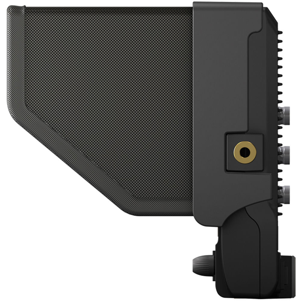 The four front panel buttons and four rotating knobs can be assigned to specific functions that allow you to call up often-used menu functions. You can power the monitor by using the included battery plates or the 4-pin XLR connector. The included 4-pin XLR power cable features a barrel connector and three pigtail cables for connecting to a tally system. The monitor features a tally indicator on the front of the monitor. An assortment of supplied accessories includes a Sony L-type and Canon LP-E6-type battery plates. The monitor incorporates a 1/4″-20 threaded mounting hole on the bottom and on each side, and the included sun hood attaches via hook and loop fastener to a removable sun hood attachment frame. A V-mount and Gold mount plate adapter allows you to mount optional V-mount or Gold mount battery plates.