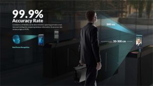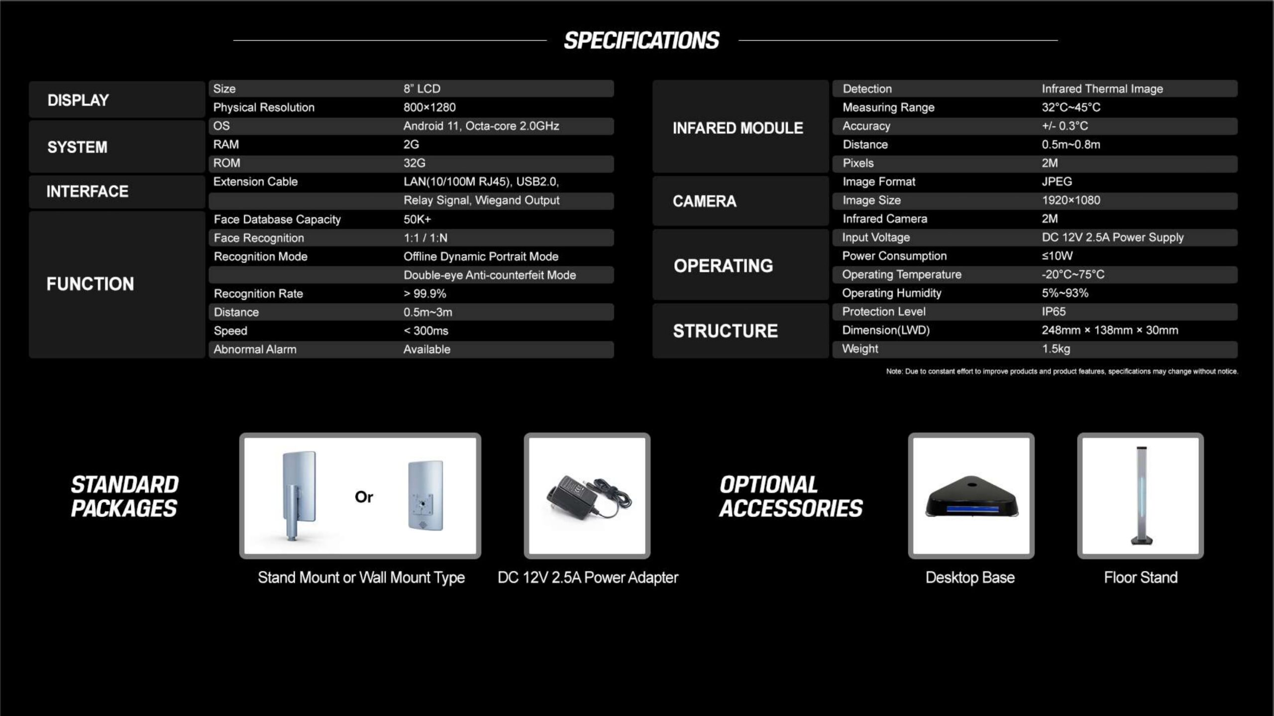 When used for face recognition, it is recommended that the Lilliput TMT-8 terminal is placed at a height of 1.4m to 1.9m. Individuals being screened should stand between 0.5 and 1.5m away. The terminal can determine facial recognition within 1s per person and is 99% accurate. In addition the Lilliput TMT-8 can be programmed to issue a particular alert when a person being screened is not wearing a face mask.